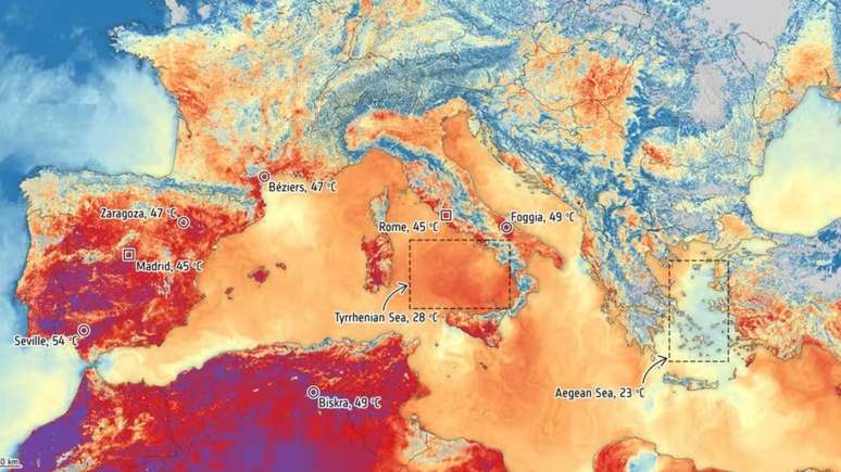 Na Espanha, a situação se agrava com incêndios florestais, como em Lérida, onde dois moradores morreram. Em Tarragona, uma criança de dois anos foi esquecida em um carro sob o sol e não resistiu. Em Huelva, os termômetros marcaram até 46°C. Em Barcelona, foram ativados protocolos de emergência, com distribuição de água a moradores de rua e envio de mensagens com alertas de segurança.