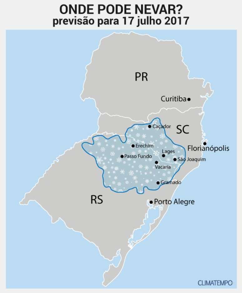 Confira o mapa da possibilidade de neve no Sul do Brasil para 17 de julho de 2017