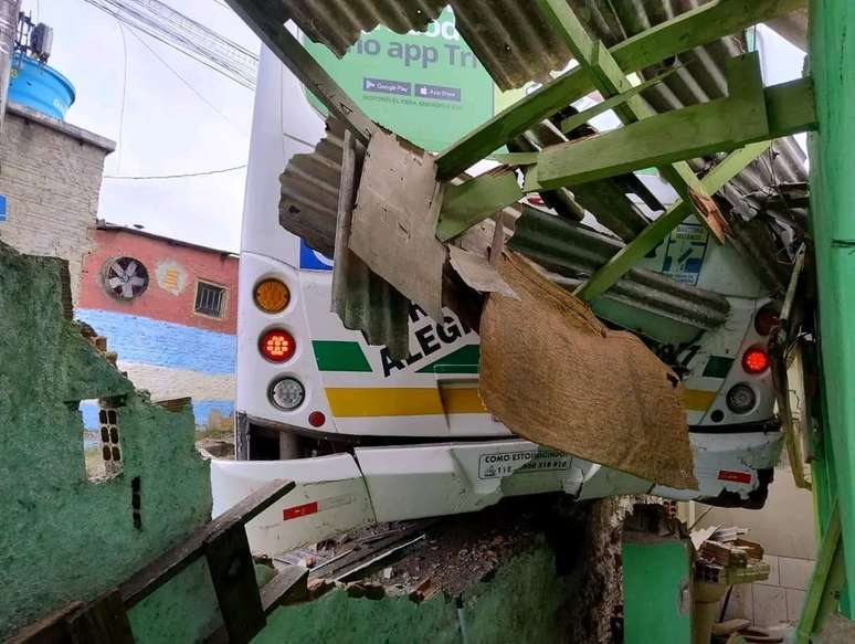 Imagens compartilhadas nas redes sociais mostram o ônibus parcialmente dentro da casa, com parte da estrutura do imóvel comprometida.