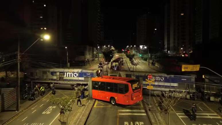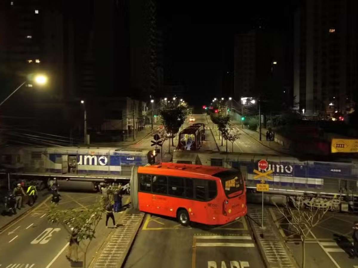 Um ônibus biarticulado partiu ao meio após ser atingido por um trem na noite de terça-feira (22), em Curitiba. O acidente ocorreu por volta das 23h30, na Avenida Paraná, no bairro Cabral. A colisão deixou 11 pessoas feridas, segundo informações repassadas pelas autoridades locais.