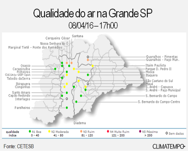 Pelo segundo dia consecutivo a Cetesb (Companhia Ambiental do Estado de São Paulo) registrou qualidade do ar “muito ruim” por excesso de ozônio em áreas do estado. Na Grande São Paulo, a qualidade do ar às 17 horas foi considerada ruim em Guarulhos (Paço Municipal) e na capital nos bairros de Santana e Nossa Senhora do Ó. Veja o panorama às 17 horas na Grande São Paulo.