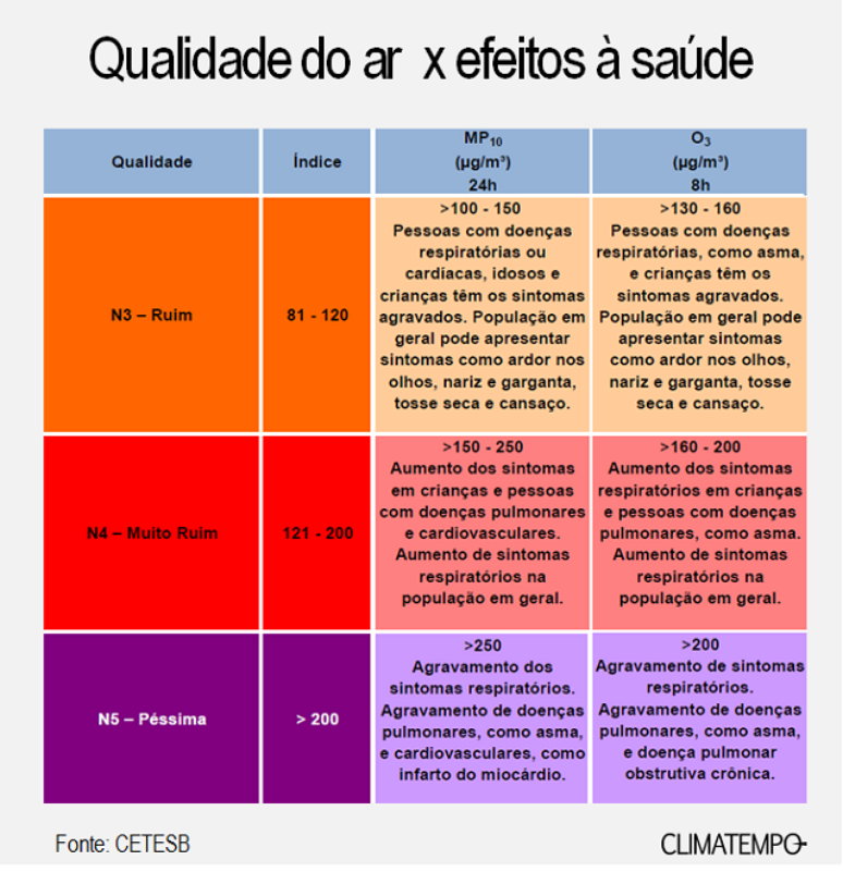 Confira alguns efeitos negativos à saúde provocados pelas diferentes concentrações de MP10 (material particulado) e do Ozônio (O3).