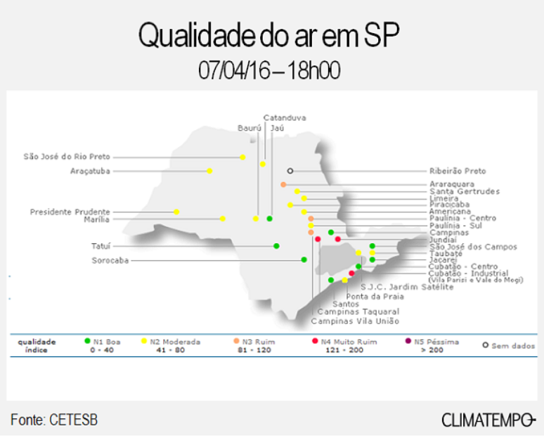 No interior, às 18 horas, a região de Campinas/Taquaral e de Jundiaí tiveram qualidade do ar “muito ruim” por excesso de ozônio. No litoral, no mesmo horário, a região de Cubatão/Vila Parisi tinha qualidade do ar “muito ruim”, mas por excesso de MP10 (material particulado). Mas situação nesta região foi ainda mais crítica na madrugada desta sexta-feira e até às 10 horas, quando a qualidade do ar foi considerada “péssima”.