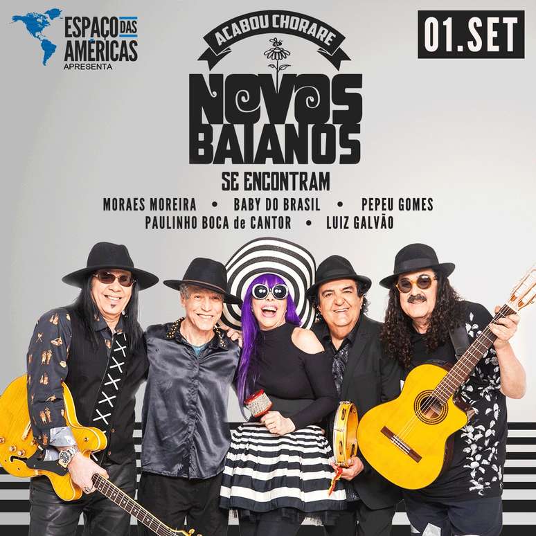 Os Novos Baianos - Moraes Moreira, Baby do Brasil, Pepeu Gomes, Paulinho Boca de Cantor, Luiz Galvão - continuam na estrada com sua turnê "Acabou Chorare os Novos Baianos se encontram". Desta vez, eles desembarcam no Espaço das Américas, um dos maiores e melhores espaços para shows de São Paulo, na sexta-feira, dia 1 de setembro, para apresentar a turnê mais comentada de 2016, que conta com um repertório marcante, passando por toda a trajetória da banda.