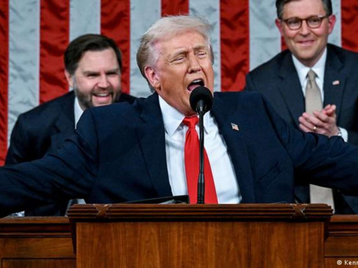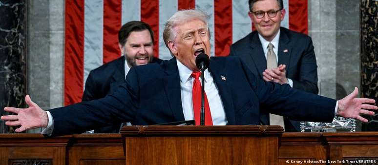 Republicano diz que gerou um boom econômico no país e impôs uma nova ordem no exterior. Veja os destaque de uma fala que visa conter queda nos índices de aprovação do governo a poucos meses de eleição.O presidente dos Estados Unidos, Donald Trump, fez nesta terça‑feira (25/02), em uma sessão conjunta do Congresso, seu discurso anual sobre o Estado da União, destacando o aumento da produção econômica, a redução nos números da imigração e a equipe masculina de hóquei no gelo dos EUA.
