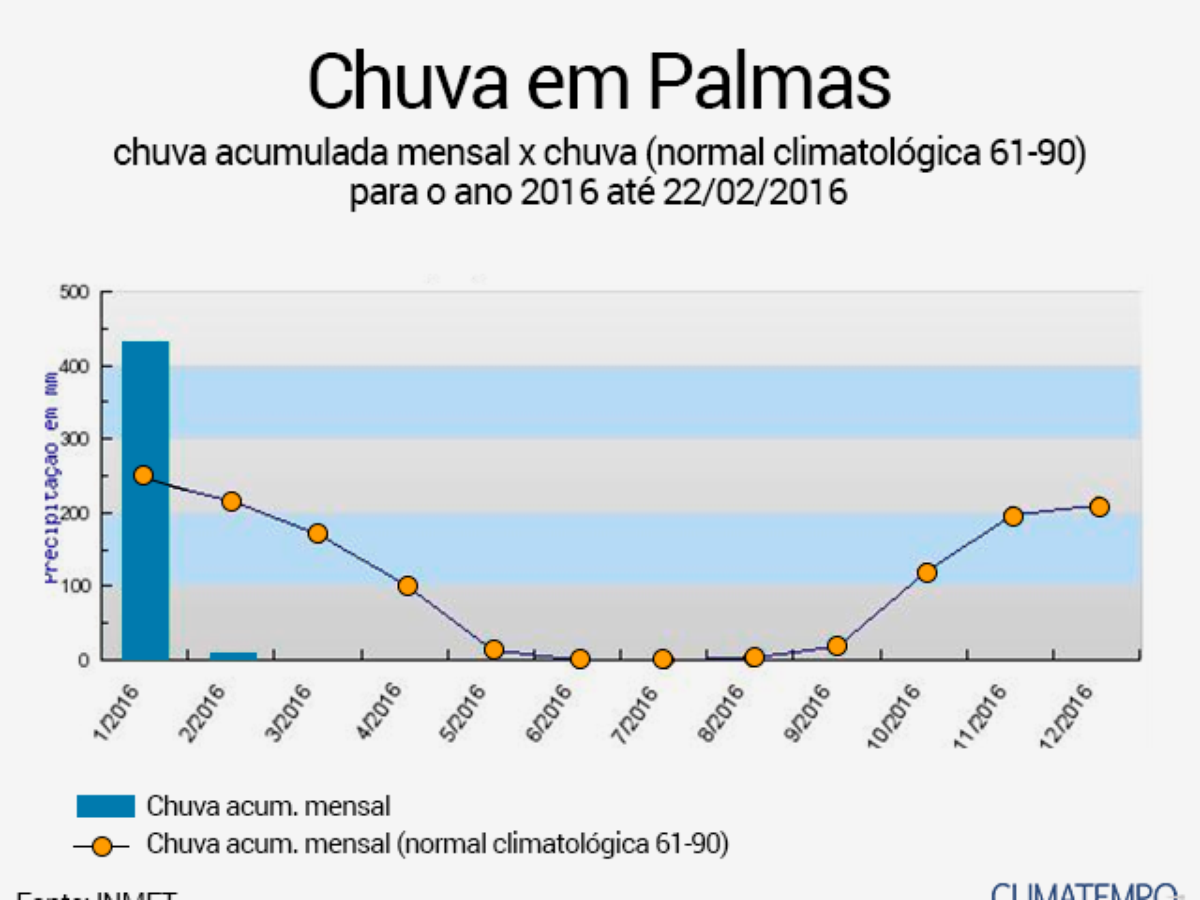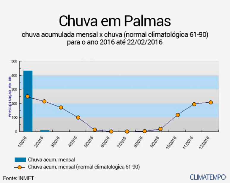 O Instituto Nacional de Meteorologia (Inmet) faz medições regulares em Palmas desde outubro de 1993. Desde esta época, nunca houve um fevereiro tão quente e seco como o deste ano.