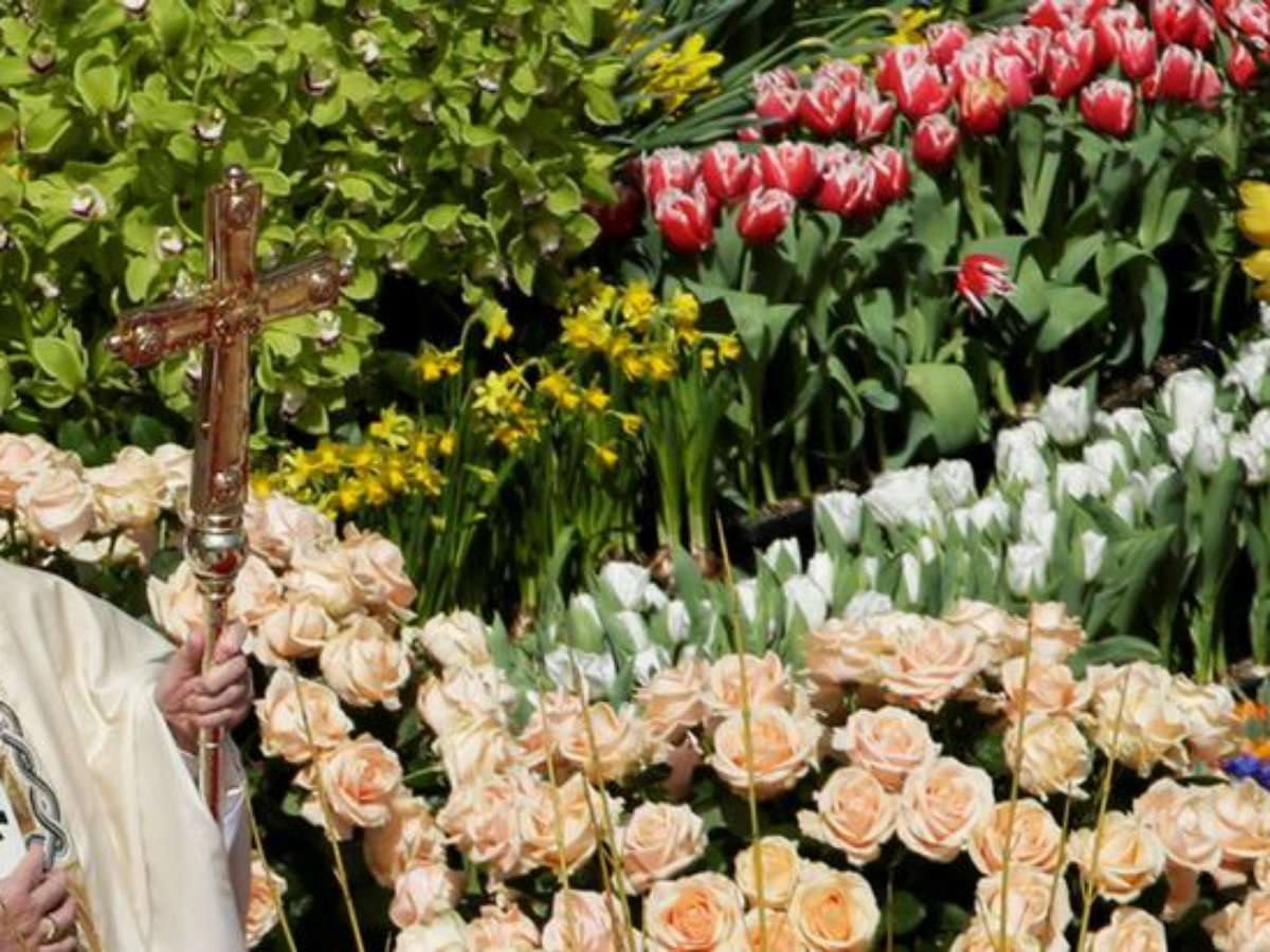 A Praça de São Pedro amanheceu decorada com milhares de flores procedentes da Holanda, como se faz desde 1985, ano em que um florista holandês decidiu realizar essa oferenda ao Vaticano a cada domingo de Páscoa.