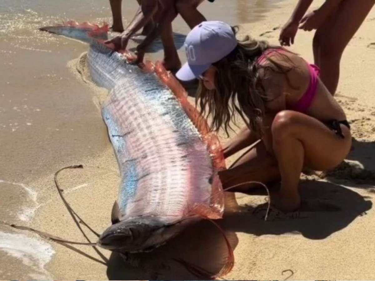 O aparecimento de dois peixes-remo, em Cabo San Lucas, assustou turistas na costa mexicana. A espécie é raramente vista fora das profundezas e carrega a fama de prever catástrofes naturais. A influenciadora Monica Pittenger registrou o momento.