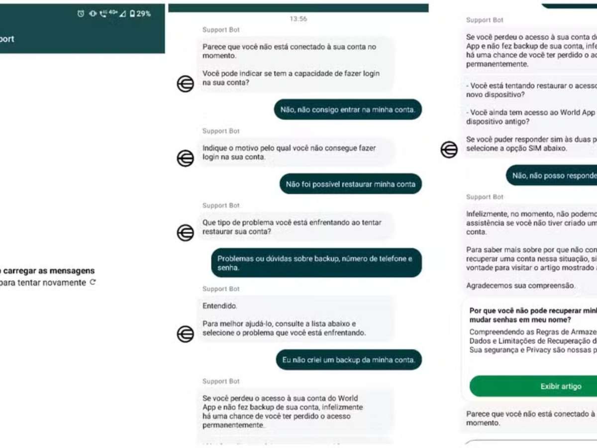 No entanto, desde janeiro, a cotação da Worldcoin caiu, e a falta de suporte ampliou as dificuldades para os usuários acessarem os valores. Durante visitas a postos de coleta em São Paulo, antes da suspensão do projeto, diversas pessoas relataram problemas para transferir o dinheiro, recuperar senhas ou reverter transações enviadas para contas erradas.