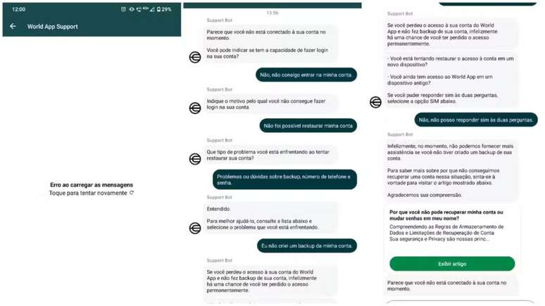 As principais reclamações dos usuários estão relacionadas ao World App, ferramenta necessária para acessar a plataforma e armazenar as criptomoedas recebidas. No entanto, relatos indicam falhas no sistema e dificuldades para obter suporte da empresa.