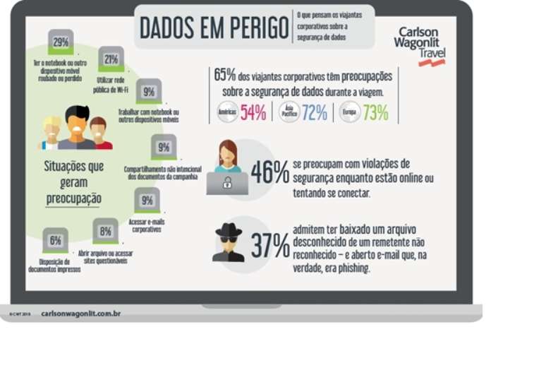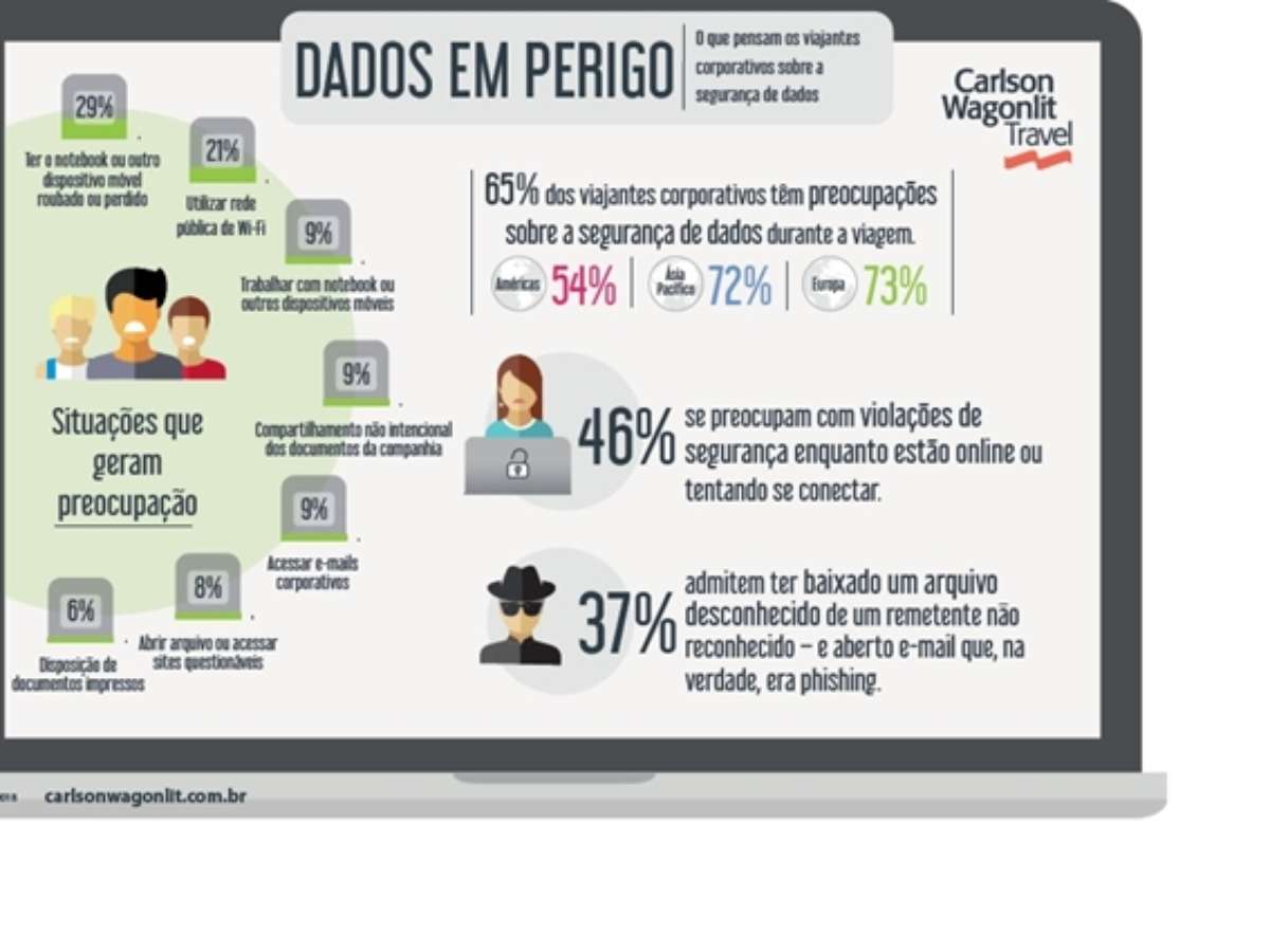 Ao viajar, há três situações nas quais os viajantes consultados afirmam estar mais preocupados em expor dados da companhia: perda ou roubo de notebooks ou outros dispositivos móveis (29%), ao utilizar rede Wi-Fi pública (21%) e ao usar seus equipamentos móveis para trabalhar (9%). Outras situações também são fonte de preocupações, como o compartilhamento acidental de documentos da companhia (9%), o acesso aos e-mails corporativos durante as viagens (8%), abertura de arquivos ou a visita a sites questionáveis (8%) e o descarte de documentos impressos (6%).