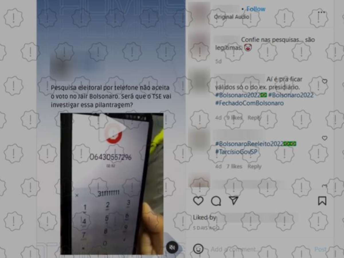 Na peça desinformativa, uma voz automatizada questiona, do celular: "E se houver um segundo turno entre Bolsonaro e Lula, hoje, em quem você votaria?". O Aos Fatos verificou todos os questionários eleitorais submetidos ao PesqEle — plataforma de registro de pesquisas do TSE — nos anos de 2018 e 2022 e não encontrou a pergunta que aparece no vídeo. Em anos eleitorais, todos os levantamentos de intenção de voto que são divulgados publicamente precisam ser registrados no PesqEle, segundo resolução do TSE.