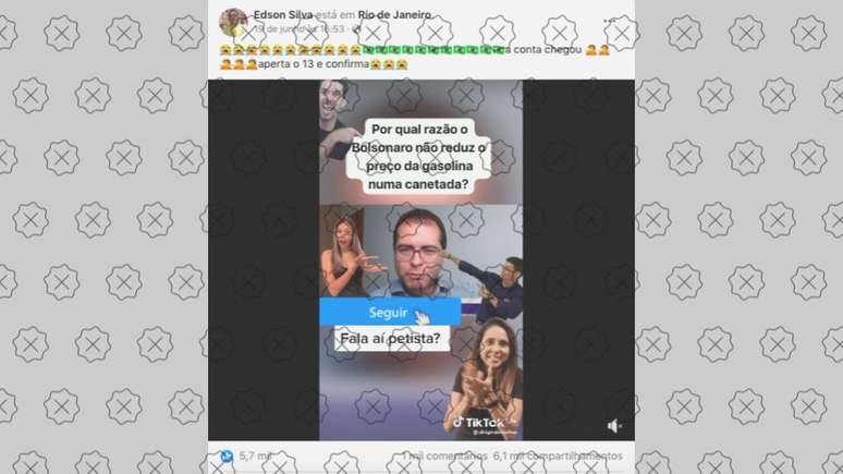 Postagens com o conteúdo enganoso reuniam mais de 6.000 compartilhamentos no Facebook até esta terça-feira (21). O conteúdo foi publicado originalmente no TikTok, onde foi visto mais de 245 mil vezes antes de ser excluído.