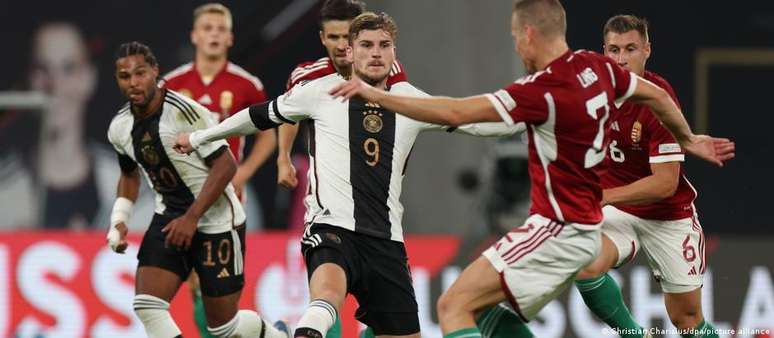 Pelo que se viu do desempenho alemão na Liga das Nações e como não há um atacante de ofício "para botar a bola lá dentro", resta a Hansi Flick montar um trio ofensivo flutuante (Werner-Havertz-Gnabry) com Thomas Müller atrás, municiando os três meias-atacantes. E ainda teria dois "coringas" na cartola - Musiala e Sané.