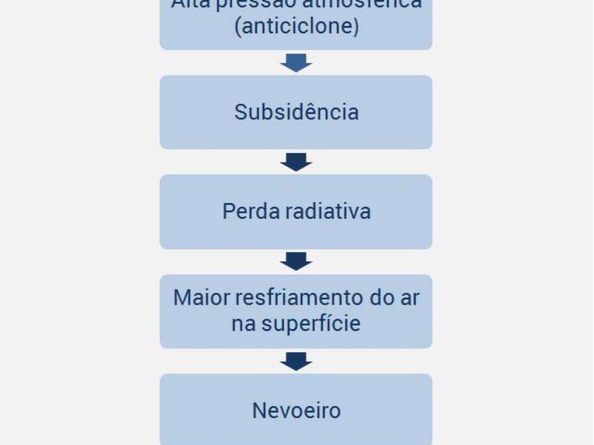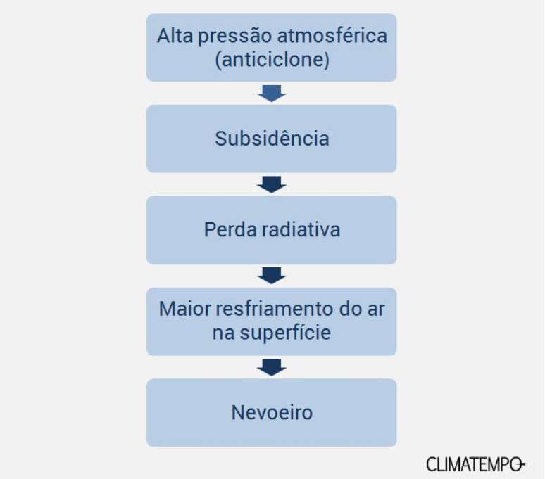 O nevoeiro se formou por causa da subsidência criada por um grande sistema de alta pressão atmosférica que predomina sobre o Brasil. A subsidência causa maior perda radiativa (que é perda de calor para o espaço), o que faz com que o ar perto do chão esfrie mais. O resfriamento condensa o ar úmido perto da superfície e o nevoeiro se forma.