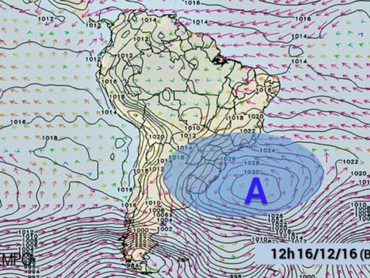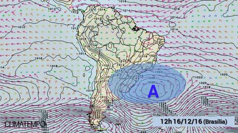 No mapa, a letra A indica a posição do centro da alta pressão polar (massa de ar polar) previsto para às 10h do dia 16/12/16. Um valor de pressão de 1030 hPa é alto no outono/inverno, quando é comum termos a passagem das massas polares fortes pelo Brasil, mas tecnicamente é um valor muito elevado para dezembro.