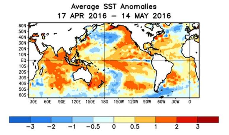 Anomalia da temperatura da água do mar entre 17 de abril e 14 de maio de 2016. Os tons de alaranjado indicam anomalia positiva, isto é, temperatura acima da média.