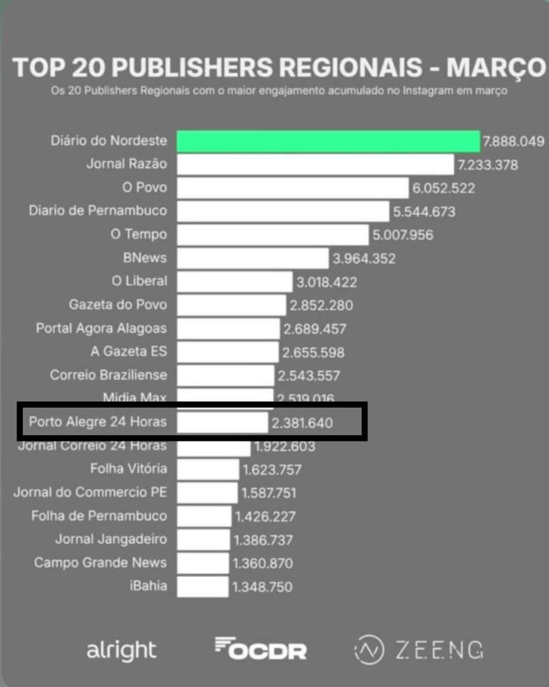 O levantamento que avalia alcance, engajamento e relevância nas plataformas digitais, posiciona o Porto Alegre 24 Horas à frente de outros veículos gaúchos, destacando sua forte conexão com o público e a capacidade de repercutir os principais acontecimentos em tempo real.