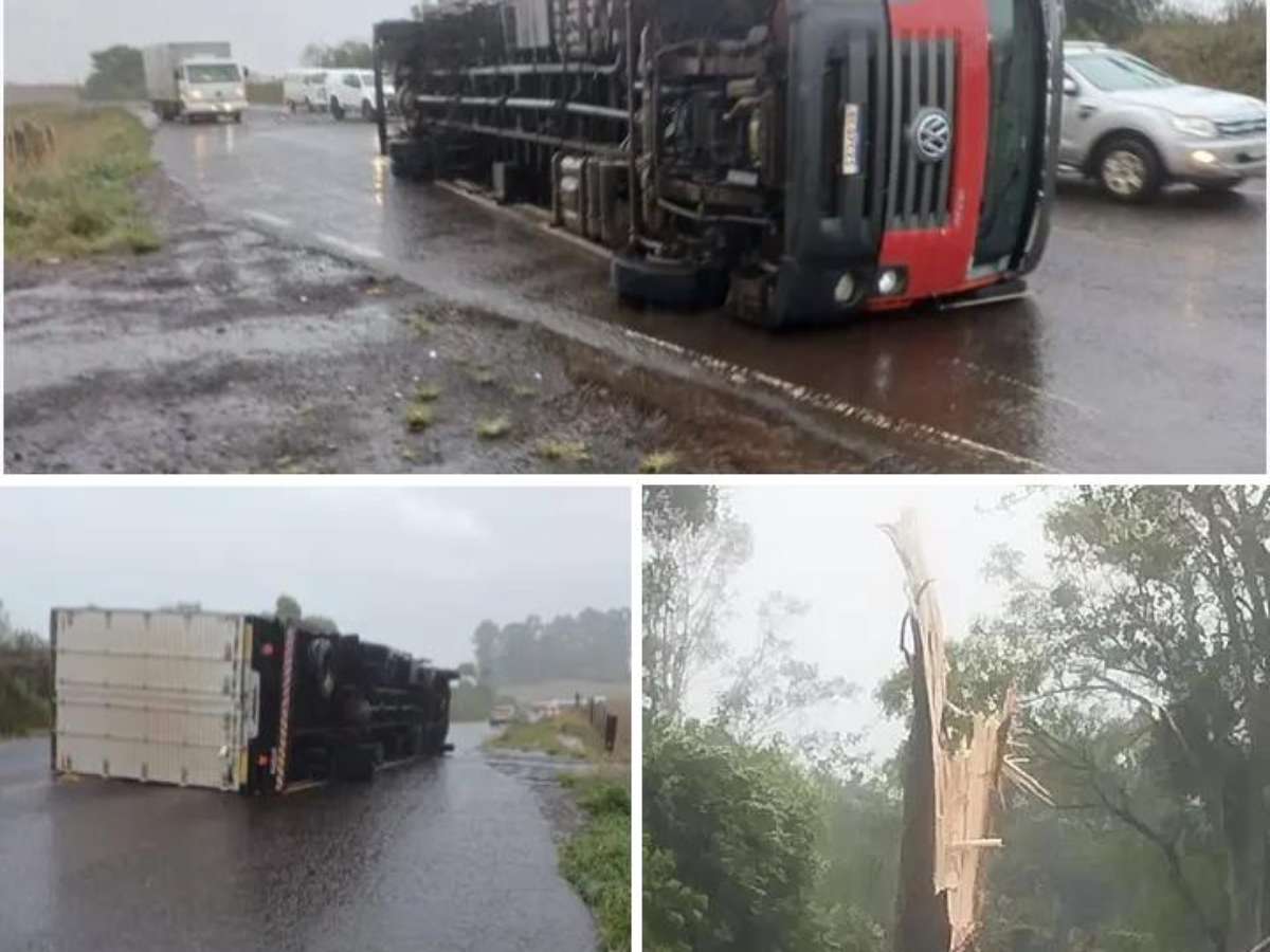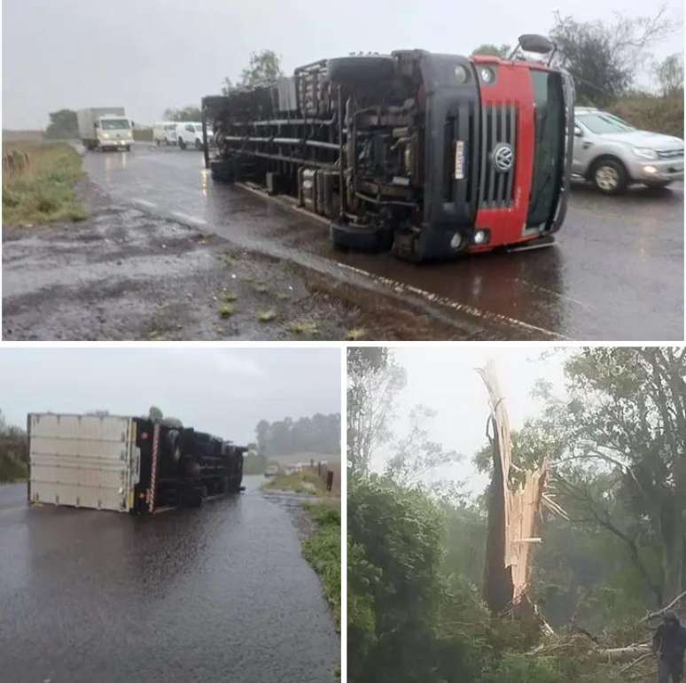 Um temporal com ventos intensos provocou destruição na manhã desta quinta-feira (23) em Cruz Alta, na Região Nordeste. A força do vento derrubou árvores, causou danos em estruturas e chegou a tombar um caminhão na BR-158.