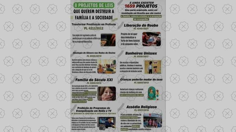 Postagens nas redes sociais compartilham uma lista com oito projetos de lei inventados ou distorcidos para afirmar que eles teriam o objetivo de "destruir a família e a sociedade" (veja aqui). Além de falsificar os termos dos projetos, mentindo sobre liberação de incesto, pedofilia, abuso sexual, mudança de sexo de crianças sem consentimento e proibição de evangelização na TV, os posts citam projetos que não estão em tramitação na Câmara dos Deputados ou que já foram arquivados, sem prazo para votação.