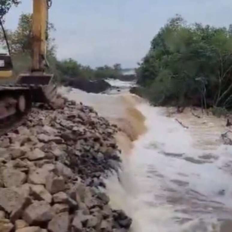 A estrutura segue extravasando desde a madrugada de sábado, 4. O transbordamento está com mais vazão de água, o que acabou nivelando a parte superior da inferior. As equipes trabalharam intensamente nos últimos dias para elevar o nível da estrutura, com a enchimentos e pedras.