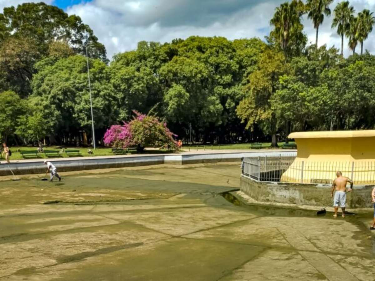 Para a limpeza dos lagos, foi necessária a retirada da água, que foi desviada para a rede pluvial. Os servidores trabalham na remoção do lodo que se acumula no fundo das estruturas.