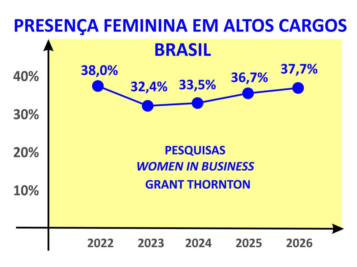 Ao relatar sobre a presença feminina em altos cargos, as pesquisas Women in Business da Grant Thornton destacam que, enquanto em 2022 o comportamento apresentava 38,0%, no ano seguinte (2023) diminuiu para 32,4%, seguido de reação para 33,5% em 2024. No ano passado, a pesquisa da Grant Thornton apontou 36,7% e, neste ano, ao acusar alta de 1,0%, atingiu 37,7%.