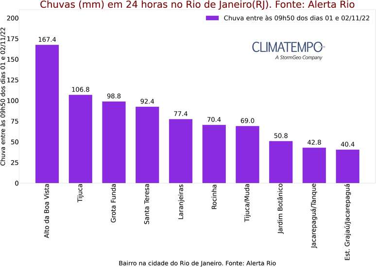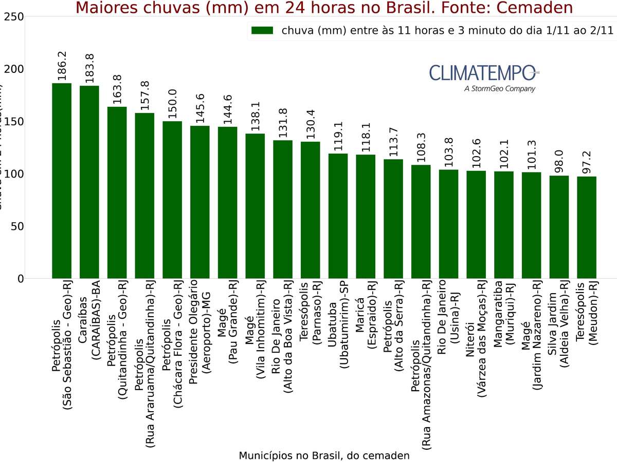 Acumulados de chuva em 24 horas nos municípios do Brasil; Fonte: Alerta Rio e Climatempo.