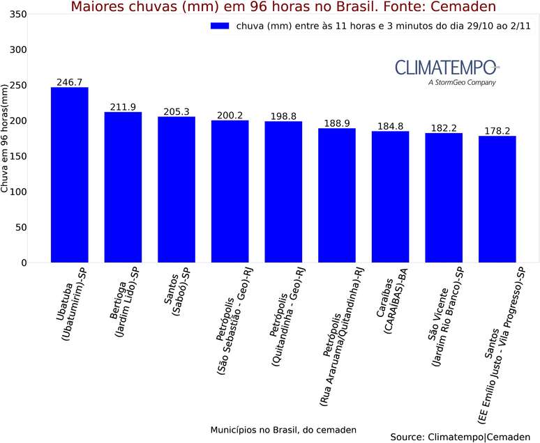 Acumulados de chuva em 96 horas nos municípios do Brasil; Fonte: Cemaden e Climatempo.