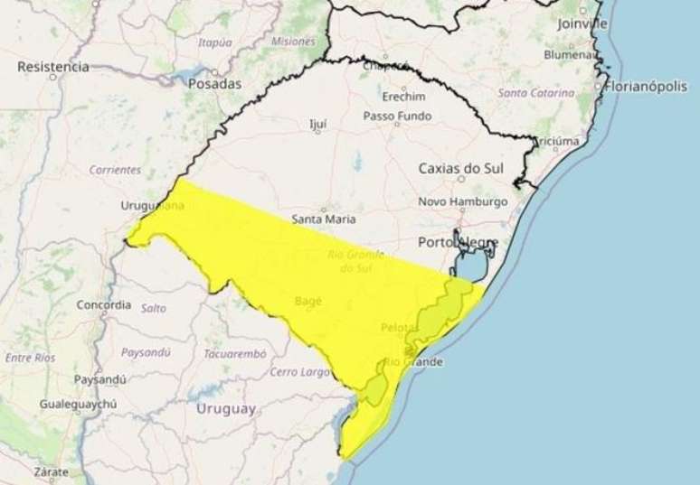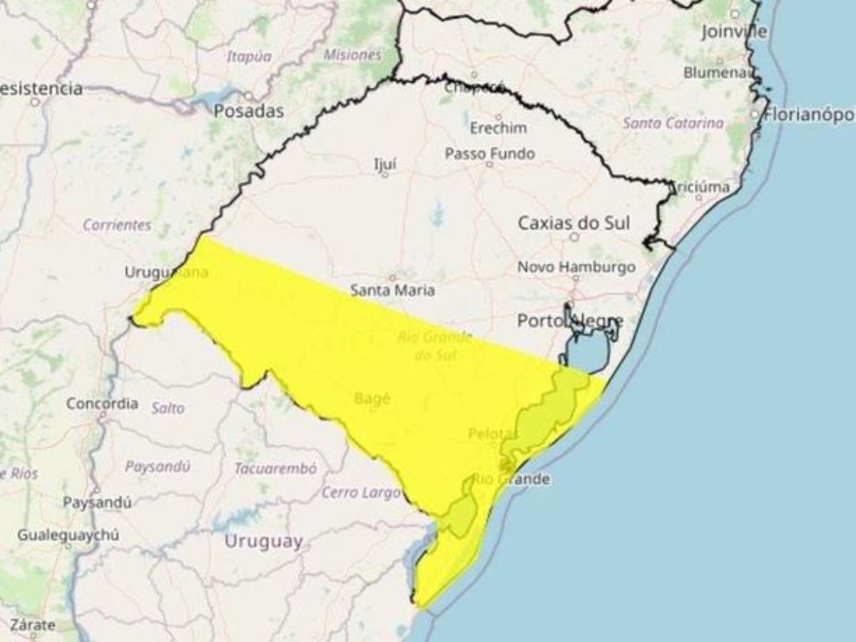 O Instituto Nacional de Meteorologia (Inmet) emitiu um alerta de tempo severo para o Rio Grande do Sul a partir das 15h de sexta-feira (14), com previsão de tempestades fortes, rajadas de vento intensas e queda de granizo até o final do sábado (15). As áreas mais atingidas devem ser as regiões Sul, Campanha, Fronteira Oeste e Centro, mas todo o estado está sob risco de alagamentos, quedas de galhos e árvores, interrupções no fornecimento de energia e danos em plantações.