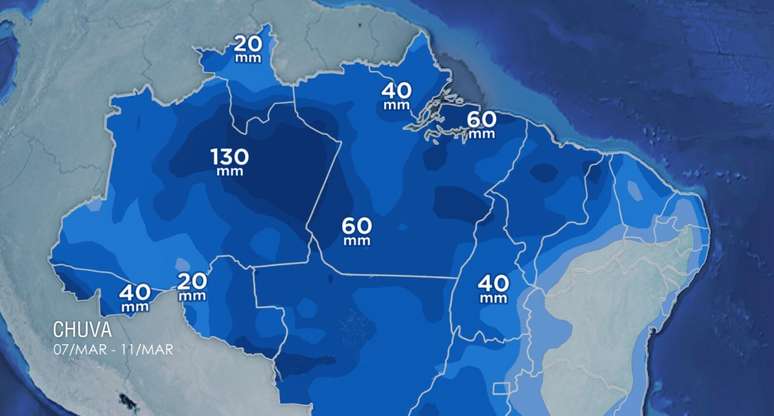 Foto: Mapa com o acumulado de chuva previsto entre os dias 7 e 11 de março na Região Norte