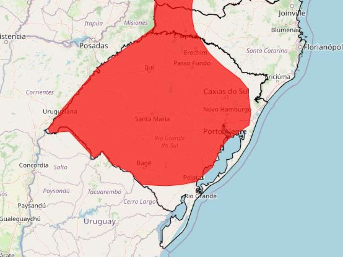 Esse alerta vermelho vai até o próximo sábado (8) e vale para além do RS, metade do Paraná, áreas de Santa Catarina, São Paulo e Mato Grosso do Sul.