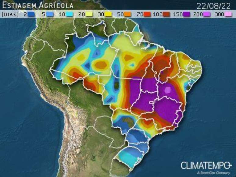 Mapa de estiagem agrícola (ou seja de dias sem chuva significativa - 10mm ou mais em um dia).Fonte: Climatempo