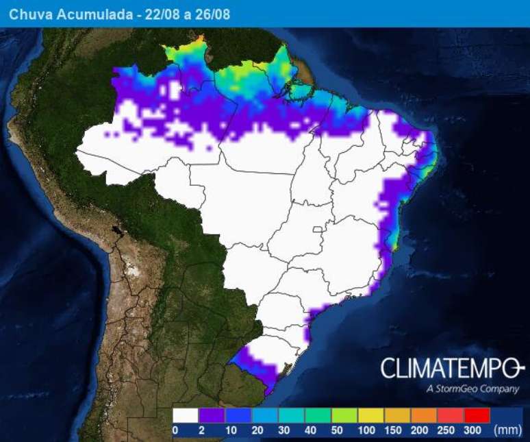 Acumulados de chuva previstos entre os dias 22/08/2022 e 26/08/2022 no Brasil. Fonte: Climatempo.