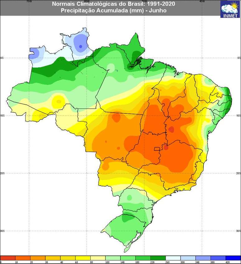 O mês de junho será de pouca chuva na capital e na maioria das áreas de Minas Gerais, como é normal durante o outono e o inverno. Vale reforçar que só em Minas Gerais, a climatologia de precipitação para junho varia entre 0 mm a 40mm. A média de chuva para junho em Belo Horizonte é de apenas 11,4mm.