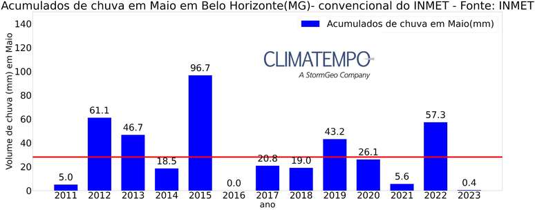 Chuva de maio em Belo Horizonte, de 2011 a 2023 (Fonte: INMET)