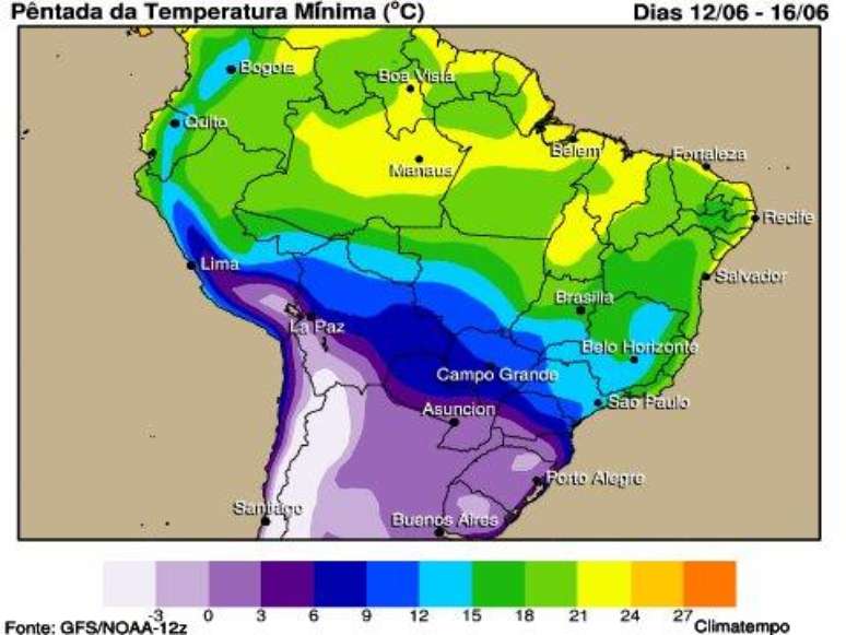 O frio forte no Brasil deve ser registrado em meados de junho na Região Sul, no sul do Mato Grosso e no oeste e sul de São Paulo. As temperaturas máximas devem ficar abaixo dos 20°C.
