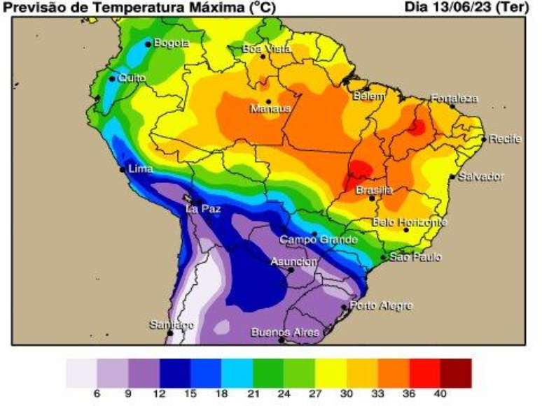 Temperatura máxima prevista para o Brasil no dia 13/05/2023.