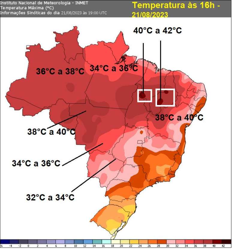 Temperatura máxima no Brasil às 16h de 21/8/2023 (Fonte: Inmet)