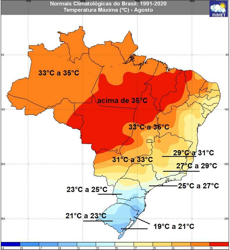 Temperatura máxima média para agosto no Brasil (Fonte: Inmet)