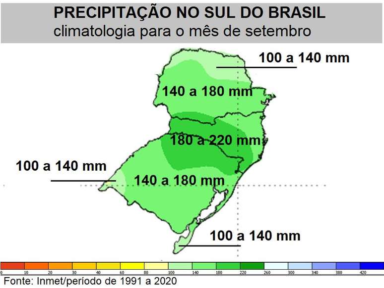 A climatologia de precipitação para o Rio Grande do Sul mostra que a média de chuva para setembro em geral não supera os 180 mm, na maioria das áreas gaúchas. Volumes médios com até 220 mm em setembro são encontrados nas regiões mais elevadas de Planalto e Serra. No extremo Sudoeste, onde está a região de Uruguaiana, por exemplo, ou na região do Chuí, as médias são as mais baixas do estado, de até 140 mm.