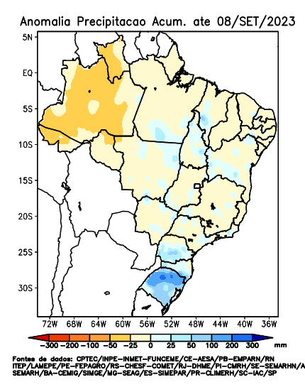 Anomalia de precipitação de setembro no Brasil, até o dia 8. Os tons de azul indicam anomalias positivas, quando a chuva supera a média (Fonte: Cptec-INPE)