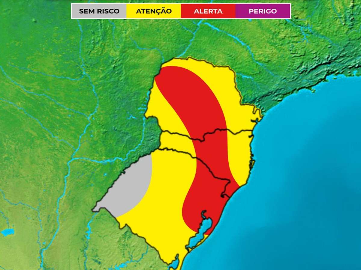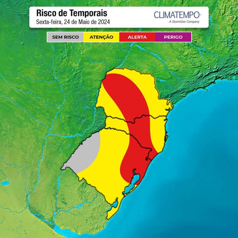 Mapa de risco de temporais no Sul do Brasil nesta sexta-feira, 24 de maio de 2024. Fonte: Climatempo.