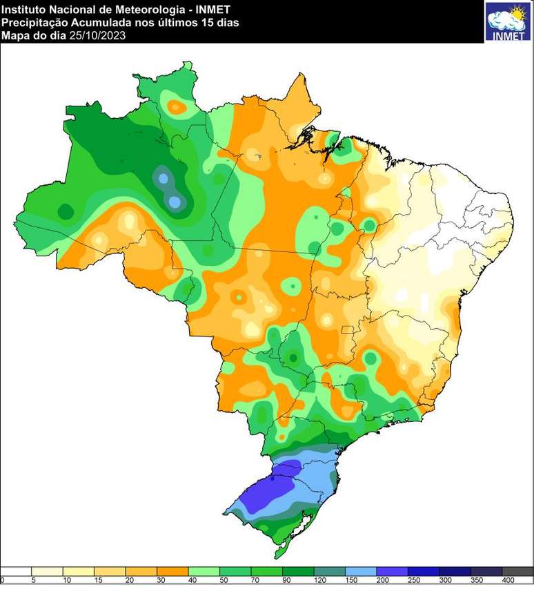 Chuva acumulada no Brasil de 10 a 25 de outubro de 2023 (Fonte: Inmet)