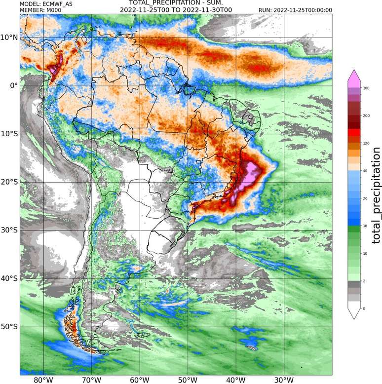 Previsão de chuva até a noite de 29 de novembro de acordo com o modelo ECMWF.