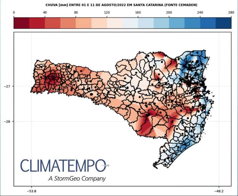 Acumulados de chuva entre 01 e 11 de agosto no estado de Santa Catarina. Fonte: Cemaden/Climatempo