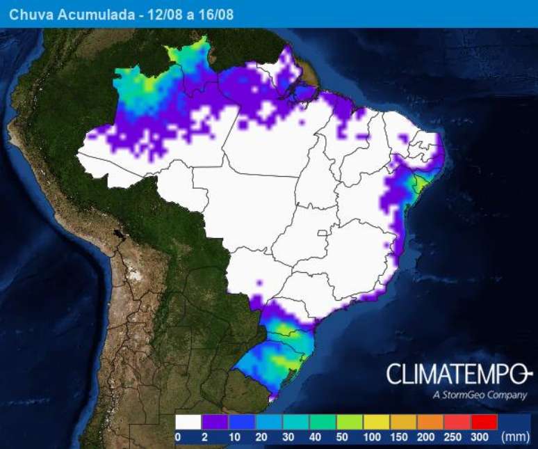 Acumulados de chuva entre 12 e 16 de agosto. Fonte: Climatempo