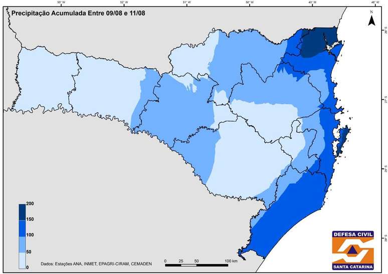 Acumulados de chuva entre os dias 09 e 11 de agosto em Santa Catarina. Fonte: Defesa Civil de Santa Catarina.