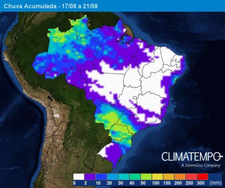Acumulados de chuva entre 17 e 21 de agosto. Fonte: Climatempo