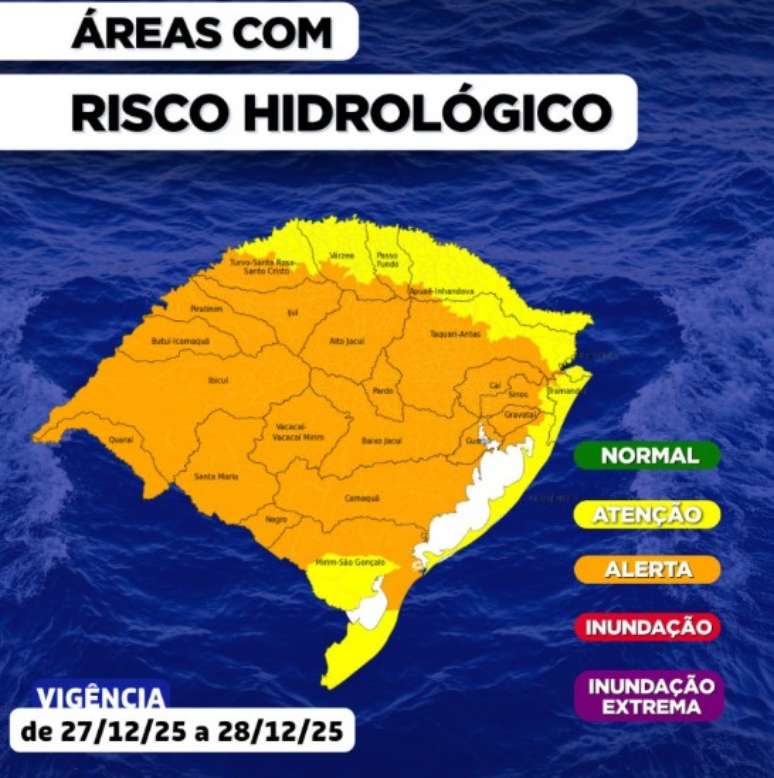 Segundo a Defesa Civil, a situação hidrológica atual apresenta níveis entre normalidade e alerta para inundação, com algumas estações em níveis mais baixos na bacia do rio Vacacaí-Vacacaí Mirim. O comportamento dos rios permanece variável em função das chuvas registradas nos últimos dias.